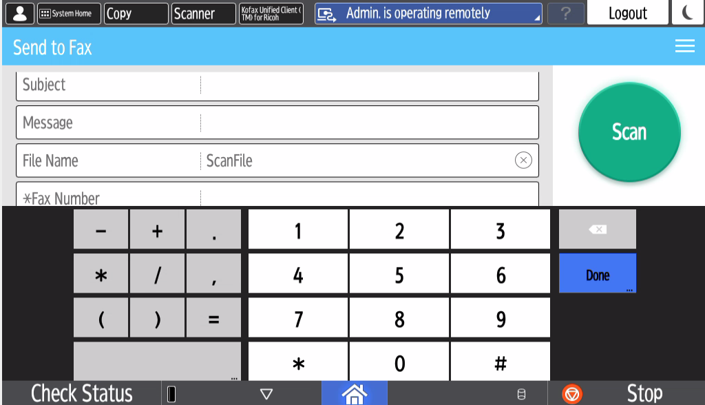 After entering the fax number, select Scan to begin. After the scan is finished, logout of the machine and you will receive a fax confirmation to your e-mail. If you do not receive a confirmation within 5-10 minutes, please contact the Help Desk via e-mail or calling EXT. 9000